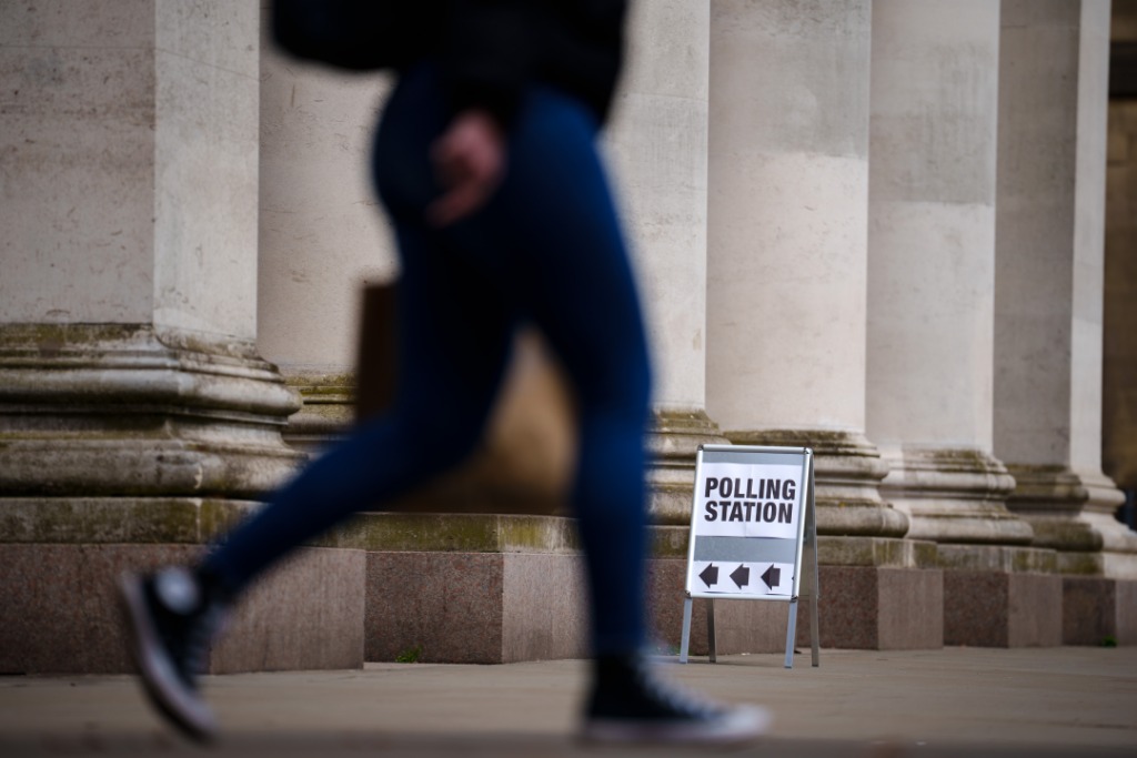 5月4日,一名行人经过英国曼彻斯特一家投票站。新华社发(乔恩·休珀摄)